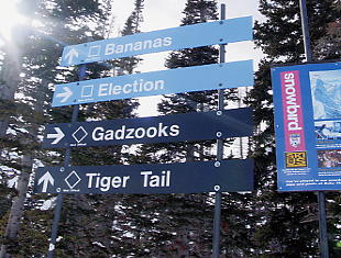 | この地図はスキーベース側から見たもので、トラムで登ったヒドゥン・ピークがスキー場最高地点になります。 右側の青い点線の「Bananas」というコースでは、滑りながら撮影した動画をこのサイトでUPしていますのでご覧ください。(ソルトレイクシティのMOVIE) |