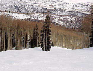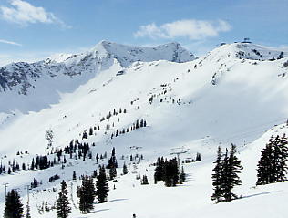 さて、このMineral Basinを滑ります!。 上記地図の緑の点線、「Lupine Loop」の途中からです。 どこを滑ってもいい(木にぶつかっても自己責任)ので、ただでさえ広いのがなおさら広く感じられます。 写真で中央に見える2つのとがった山頂がツインピークスで、右側の丸いのがヒドゥン・ピークです。 映像は明るすぎてちょっと飛んでますが・・・。 (11.6MB 2分13秒) |