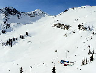 スノーバードの最高地点、ヒドゥン・ピーク(3352m)から、メインとなる斜面の裏側にあたるMineral Basinというボウルに降ります。写真の地点から降りると急斜面なので、すこし奥へトラバースしてから中斜面を滑るのですが、そこにいたるまでのコースです。角を曲がると大きなとがったAmerican Twin Peaks が見えて感動します。 (2.69MB 1分10秒) |