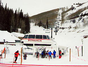 | パークシティには「PAYDAY」「BONANZA」「McCONKEY'S」「SILVERLODE」という4つもの6人乗りリフトがあります。 そのひとつ、BONANZA(金鉱脈、ぼろもうけの意味)というリフトの乗り場を見て、作法を覚えましょう。 ゲートが開いてから乗り込みます。 (2.33MB 38秒) |